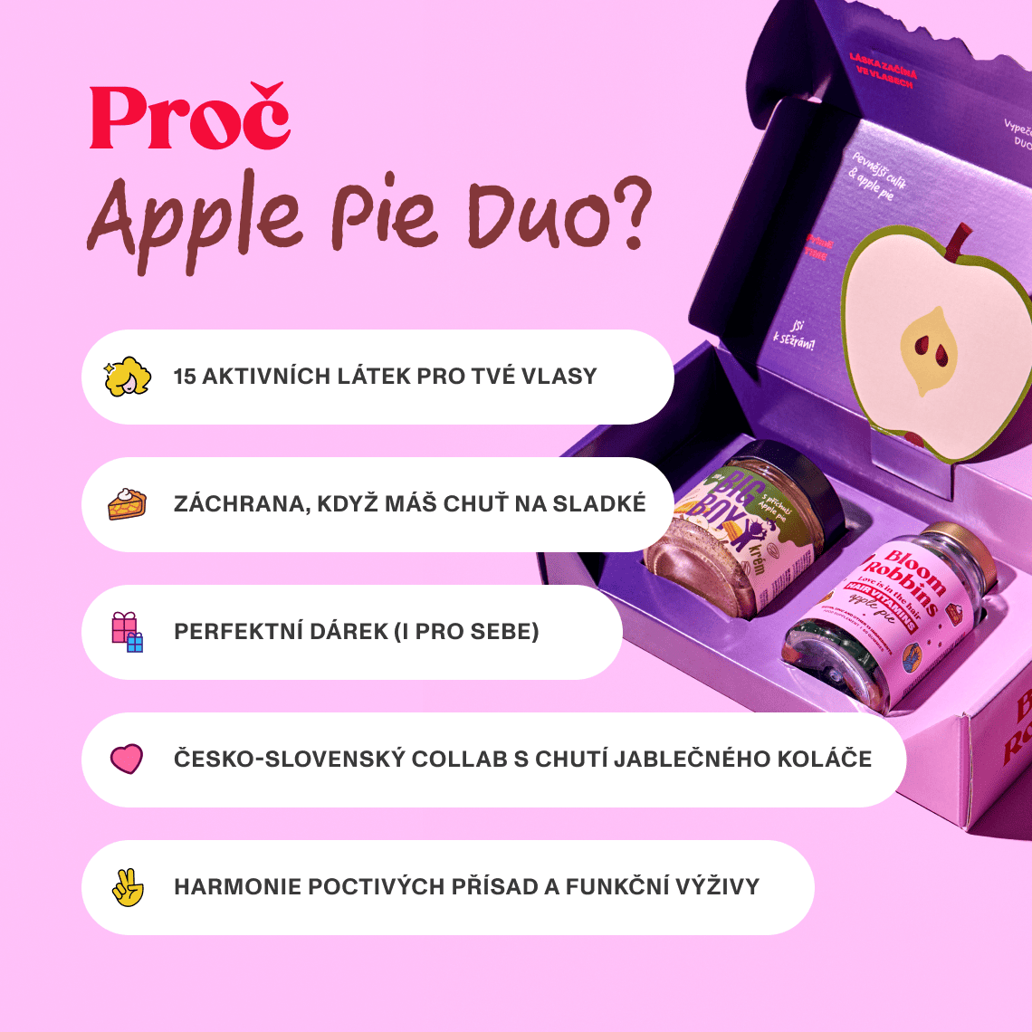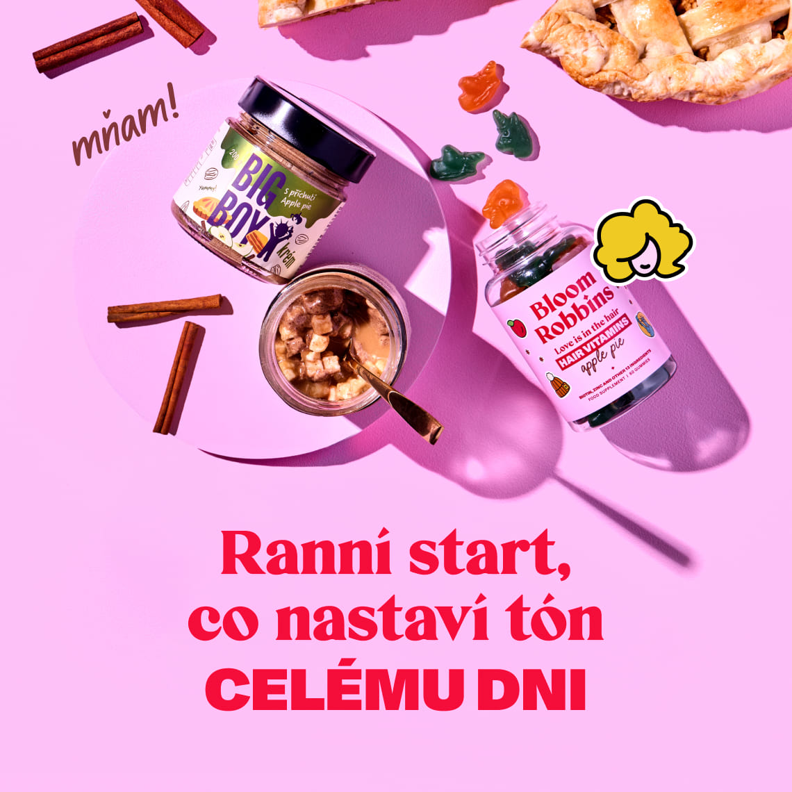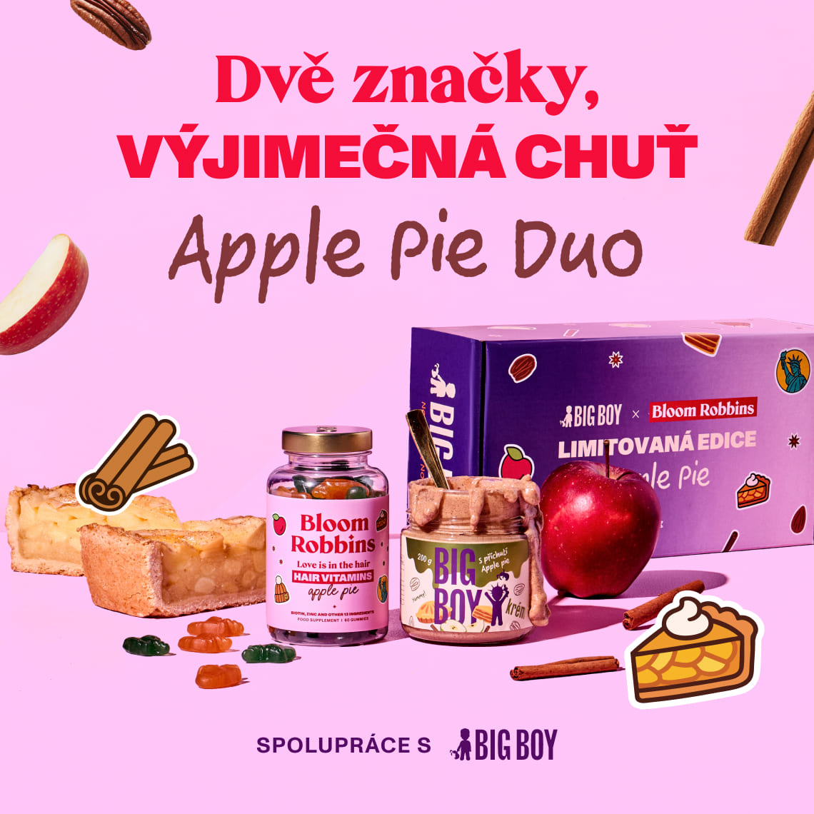 Apple Pie Duo je exkluzivní collab s parťáky z Big Boye. Přináší spojení funkčních vlasových vitamínů a poctivého ořechového krému sladěných do jedné zimní příchutě.