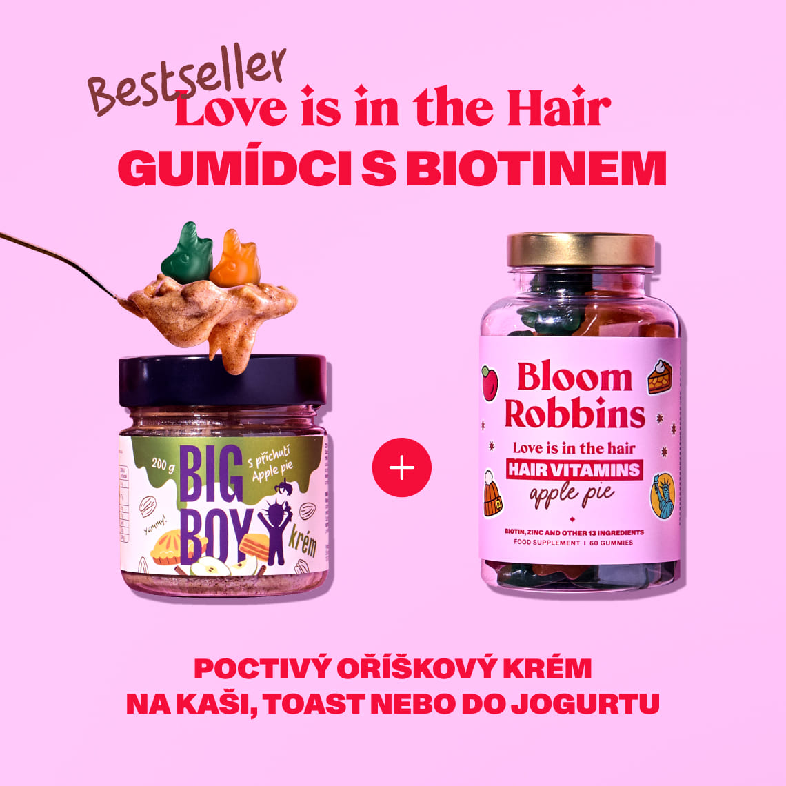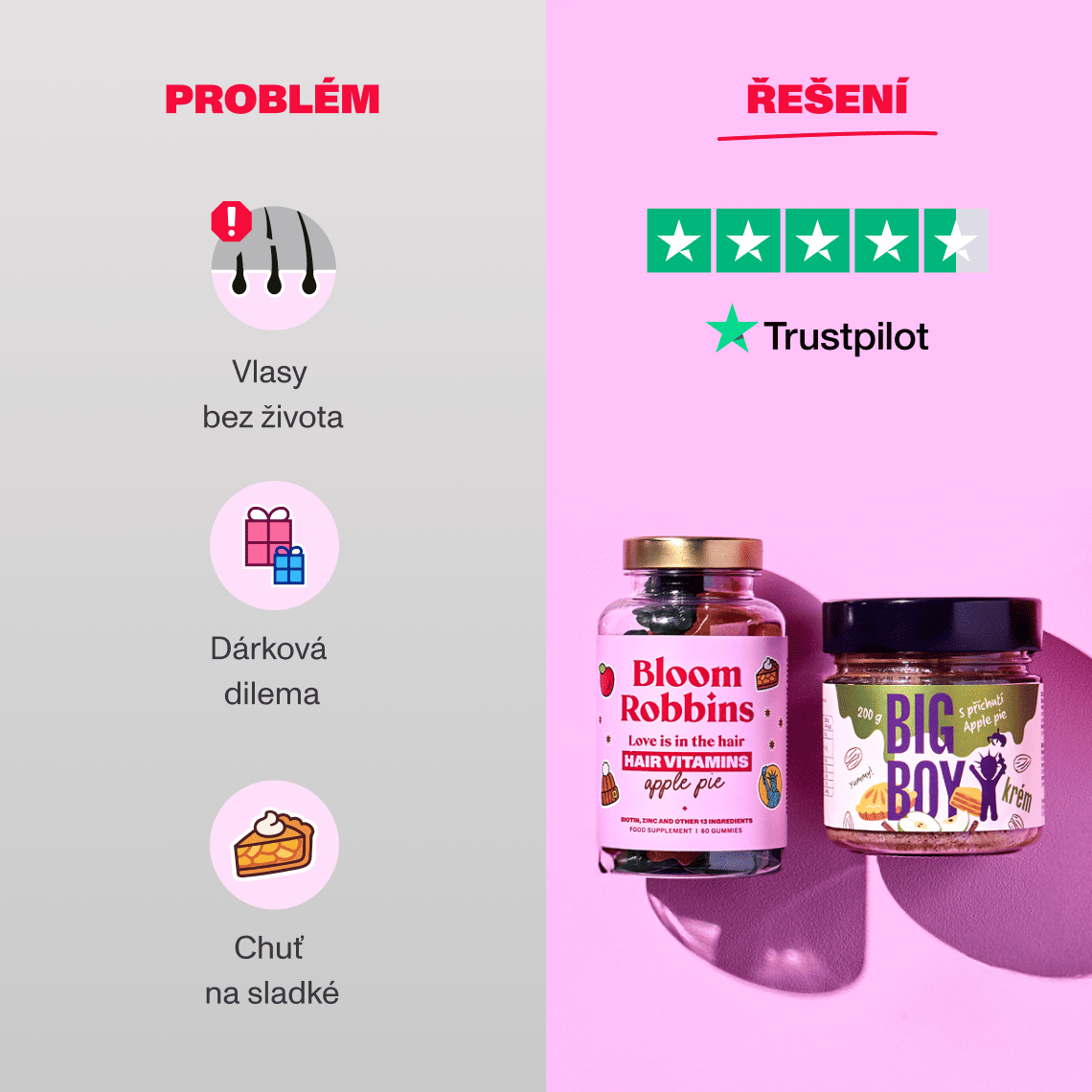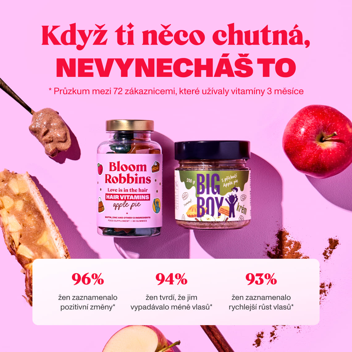 Apple Pie Duo je exkluzivní collab s parťáky z Big Boye. Přináší spojení funkčních vlasových vitamínů a poctivého ořechového krému sladěných do jedné zimní příchutě.