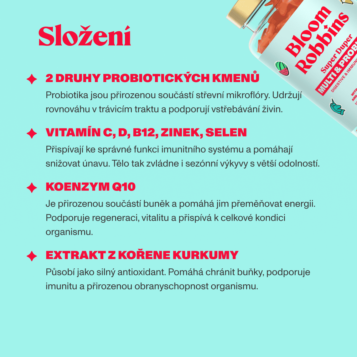 Glukózový sirup, cukr, voda, kyselina askorbová, želírovací látka (pektin), okyselující látka (kyselina citronová), ergokalciferol, regulátor kyselosti (trisodný citrát), citrát zinečnatý, tyndalizovaná směs probiotik (L. rhamnosus a B. lactis), přírodní aroma, koenzym Q10, extrakt z kurkumového kořene (Curcuma longa), rostlinný olej (kokosový olej), barvivo (paprikový extrakt E-160), vitamin B12 (kyanokobalamin), protispékavá látka (karnaubský vosk), seleničitan sodný.