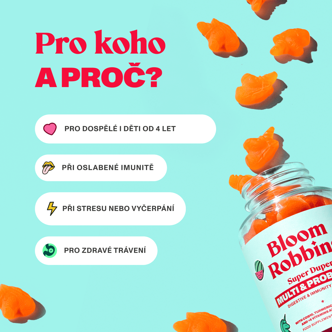 Jednorožci se svěží melounovou chutí, která zpříjemní každý jeden den a zároveň dodá tělu vše potřebné pro lepší trávení, silnější imunitu a více energie.