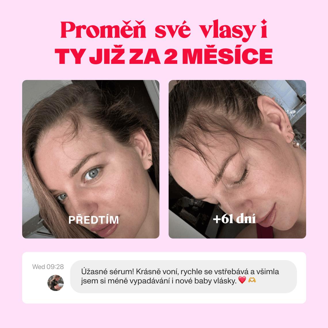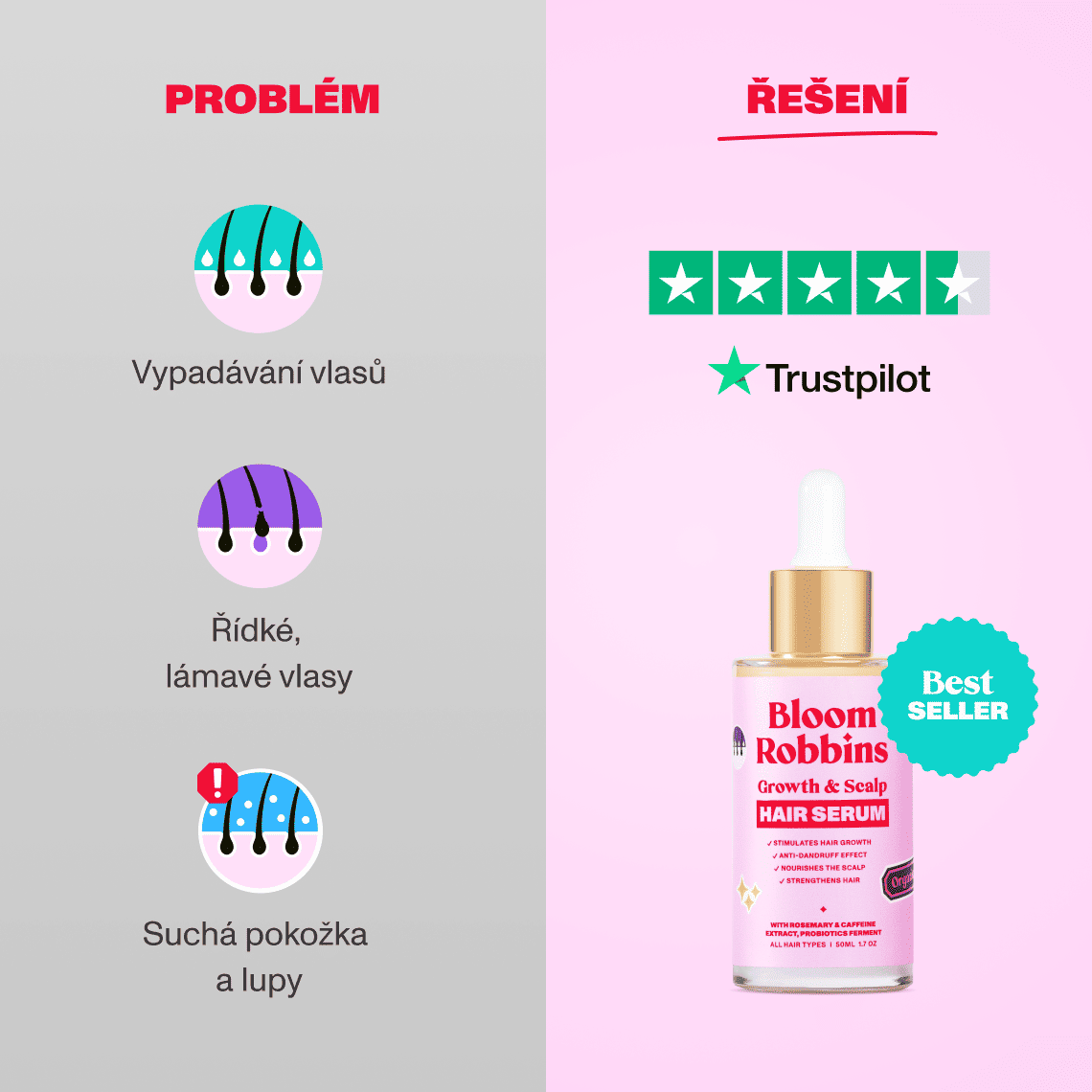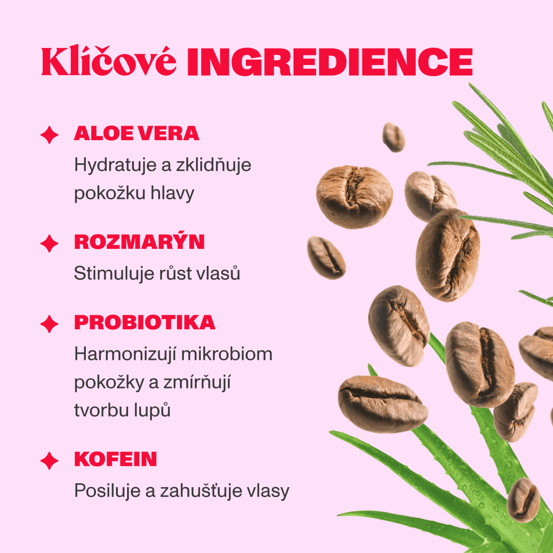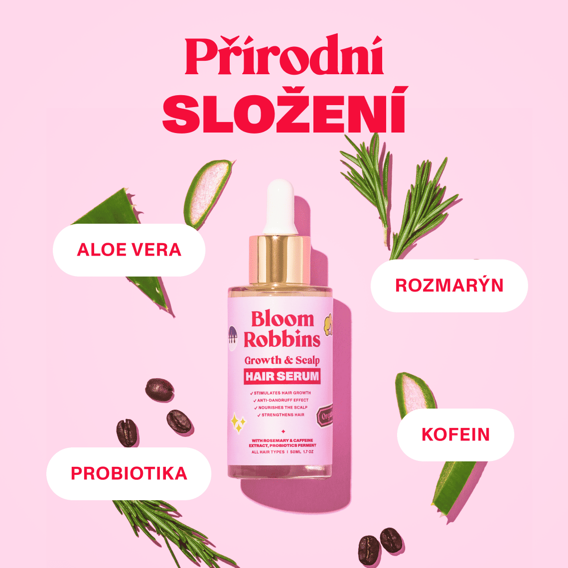 Aby tvé vlasy mohly růst do plné krásy, byly zdravé a nevypadávaly, vytvořili jsme vlasové sérum s obsahem rozmarýnu, kofeinu, aloe vera a probiotiky. Sérum vyživuje vlasovou pokožku, posiluje vlasová vlákna od kořínků a stimuluje jejich růst. Vlasy jsou díky séru hustší, silnější a zdravější.