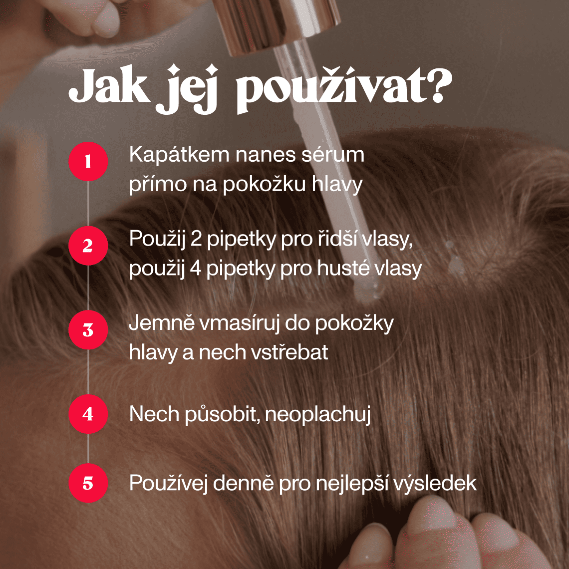 Vlasové sérum si naberte pipetkou a rovnoměrně rozdistribuujte po vlasové pokožce. Množství vlasového séra záleží na typu vlasů, ideální jsou 2 pipetky pro jemné vlasy a 4 pipetky pro husté vlasy. Krouživými pohyby si jej vmasírujte do pokožky hlavy. Produkt nezatěžuje a nemastí vlasovou pokožku a je vhodný pro každodenní použití. Vlasové sérum se po jeho nanesení nesmývá.