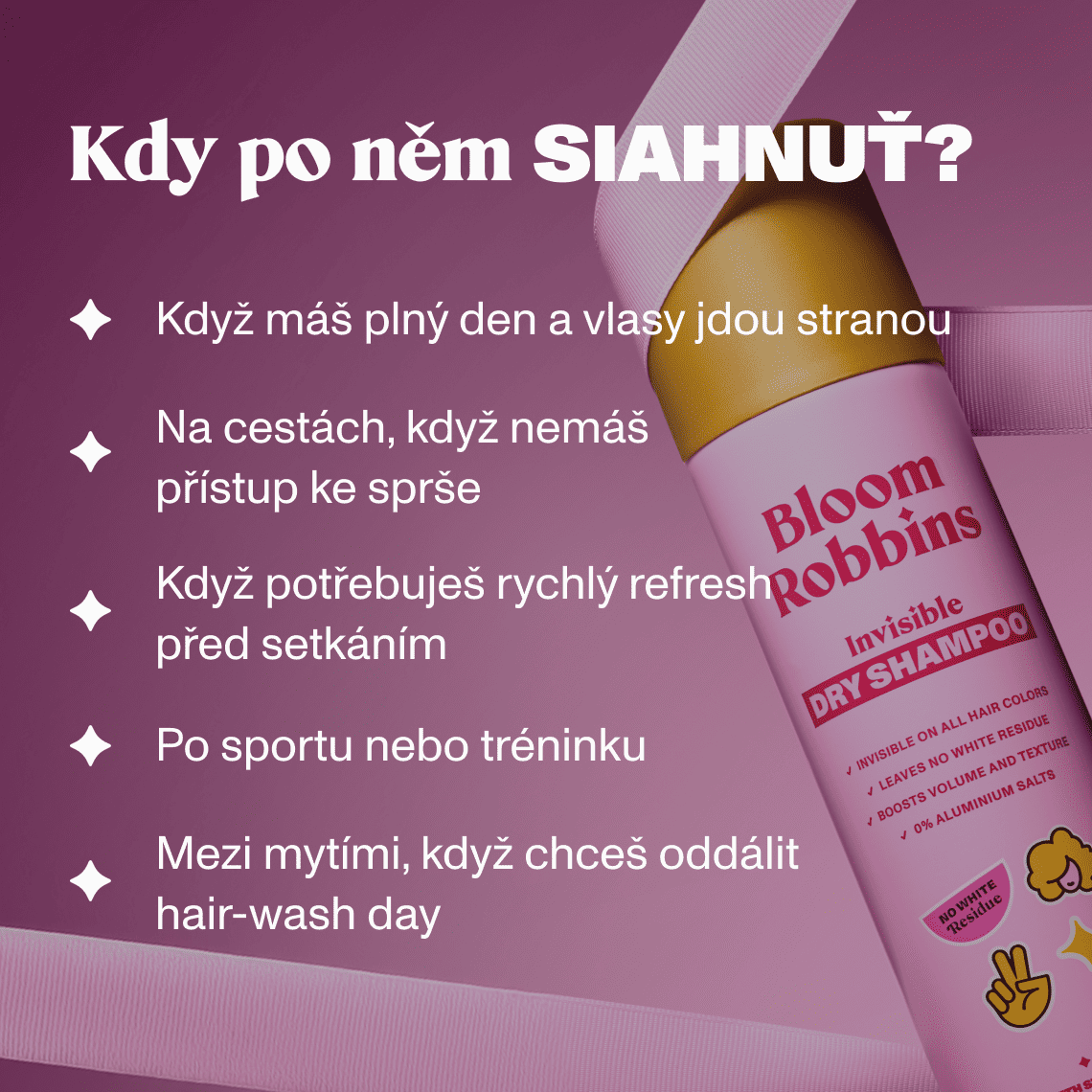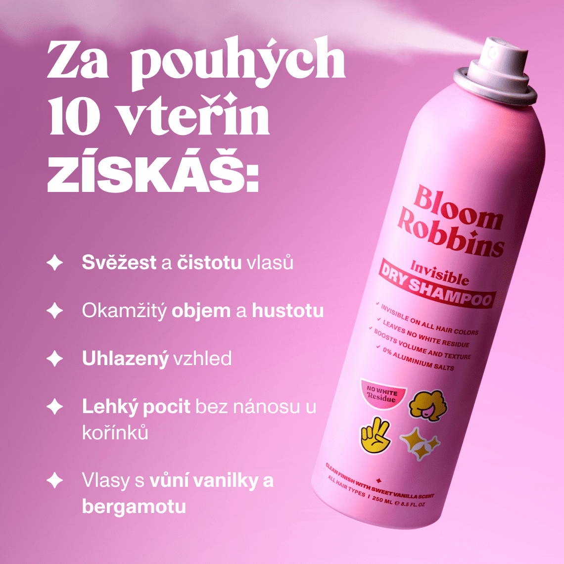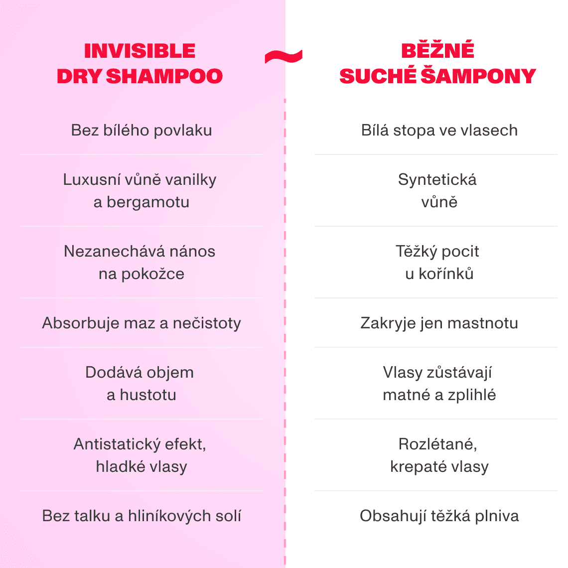 Invisible Dry Shampoo je tvůj nový hair hack pro čisté a svěží vlasy s objemem již za 10 vteřin. Pokročilá receptura s rýžovým škrobem okamžitě absorbuje maz i nečistoty. Nezanechává bílý povlak a zůstává neviditelný na každé barvě vlasů. To vše s luxusní vůní sladké vanilky s bergamotovým akcentem.