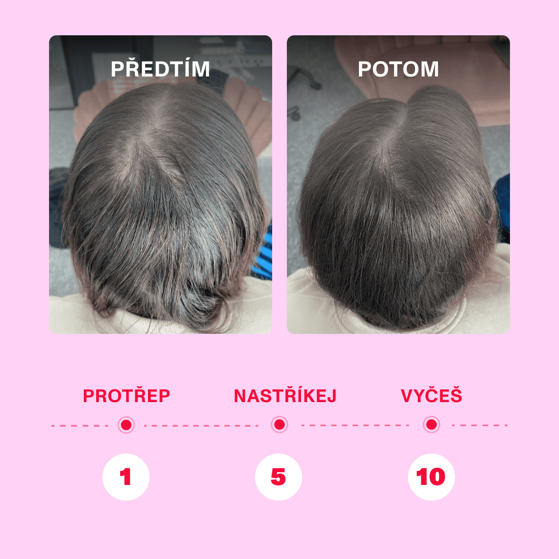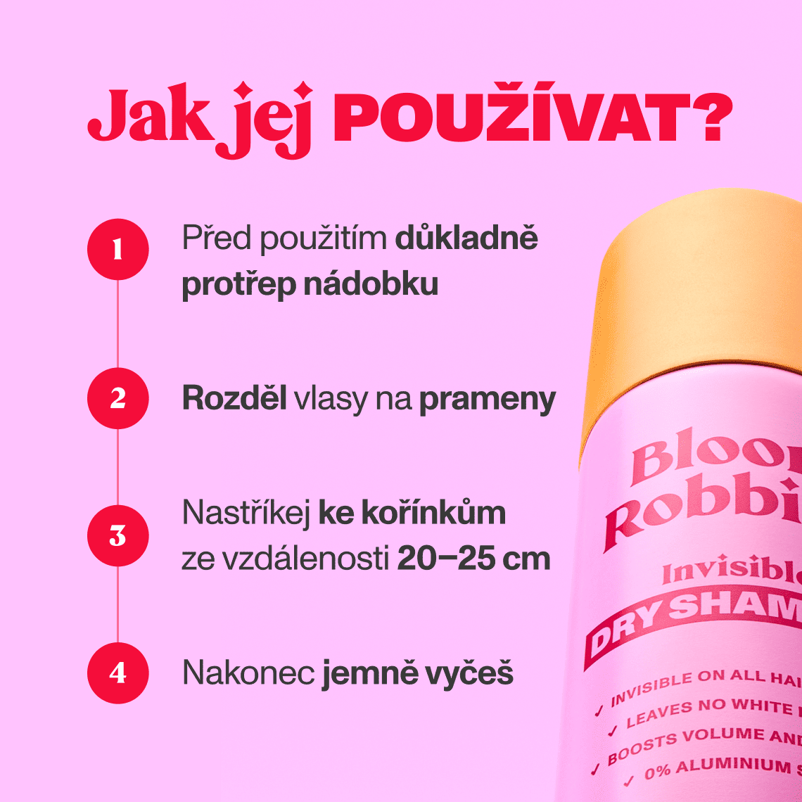 Rozděl si vlasy na rovnoměrné části. Před použitím protřep nádobku. Drž ji přibližně 20–25 cm od hlavy a nastříkej na kořínky, kde jsou vlasy nejmastnější. Potom důkladně vyčeš.